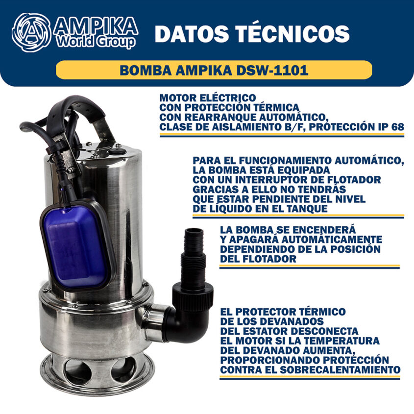 La bomba de aguas Ampika DSW-1101 está diseñada para bombear aguas residuales y fecales con partículas sólidas de hasta 35 mm de tamaño.